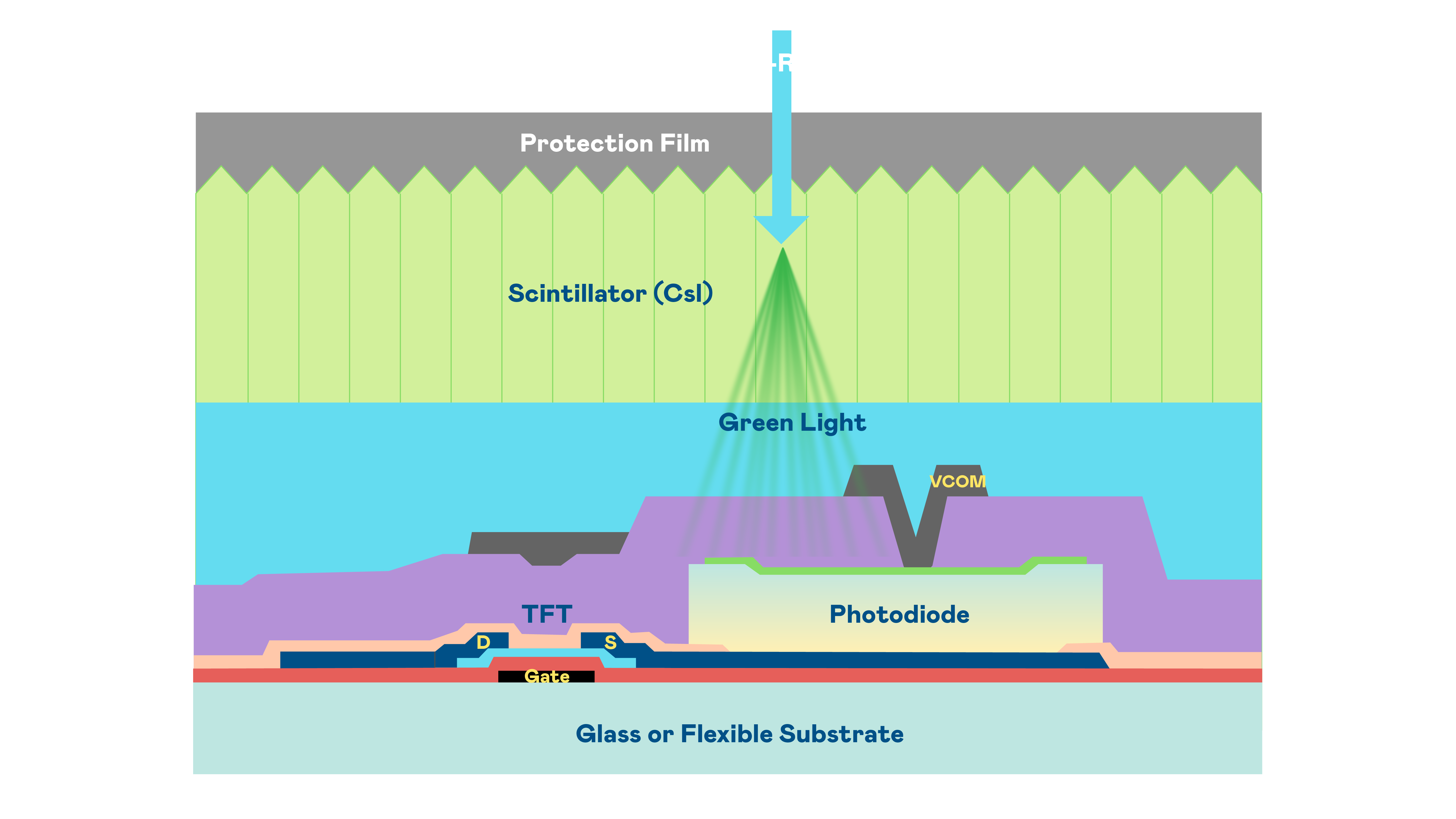 尊龙凯时人生就是博的X光影像感测阵列使用薄膜电晶体 (TFT) 作为每个像素的读取开关,搭配光电二极体(Photodiode)的光电转换元件,用以感测X光影像讯号。